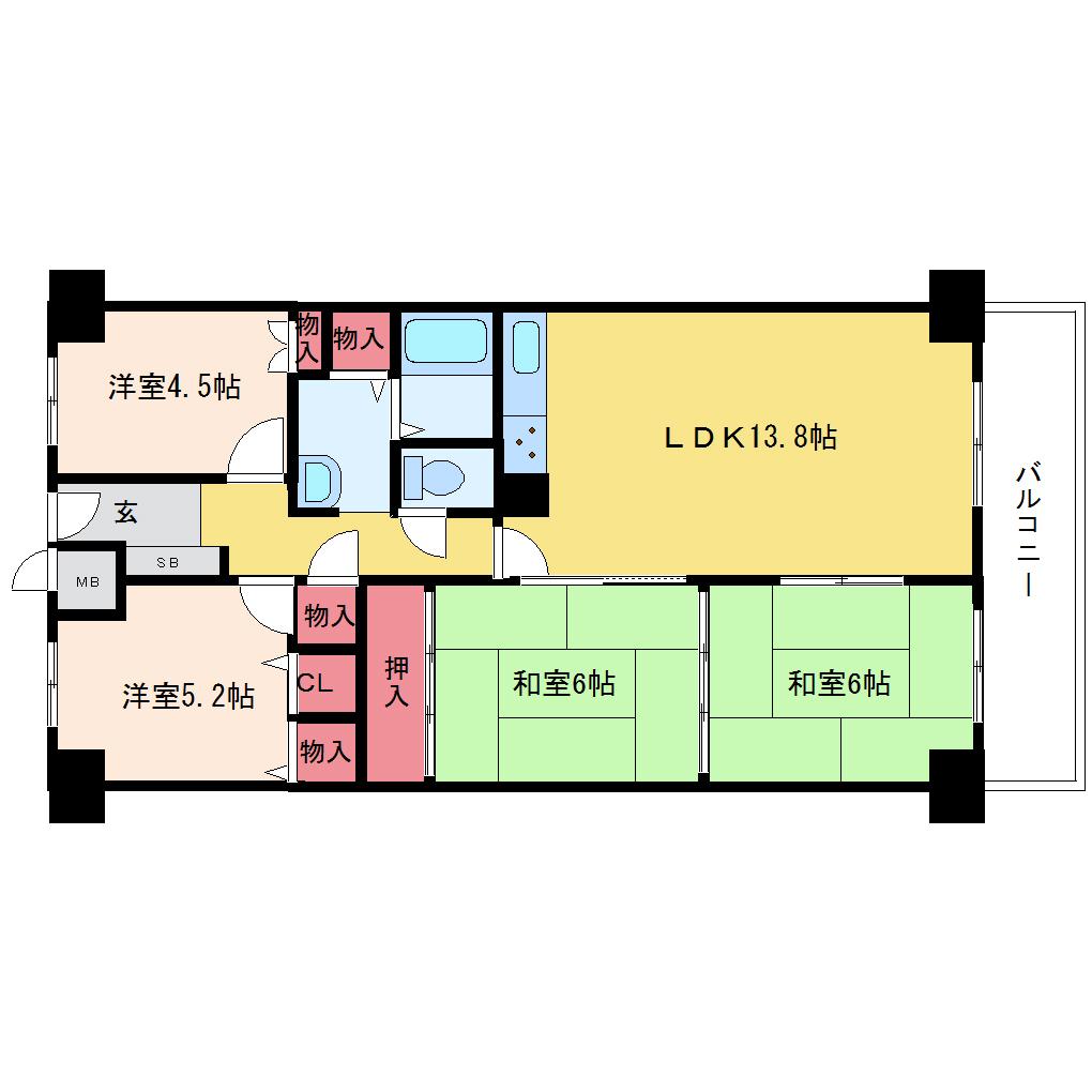 | 間取り詳細 | 洋室 5.2畳 、洋室 4.5畳 、和室 6畳 、和室 6畳 、LDK 13.8畳 |