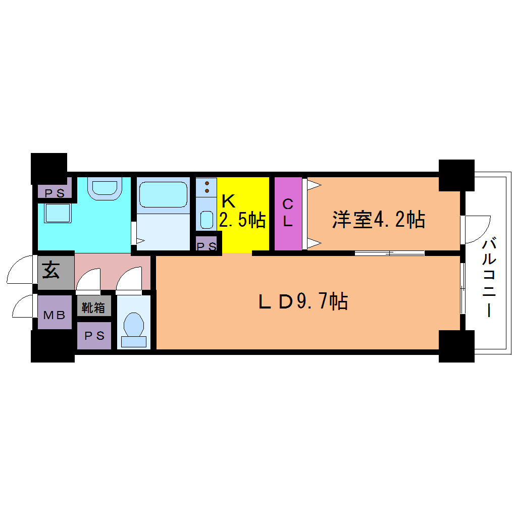 | 間取り詳細 | K 2.5畳 、LD 9.7畳 、洋室 4.2畳 |