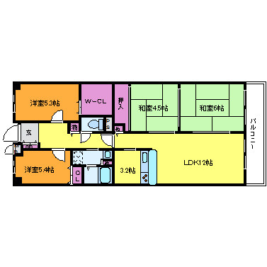 | 間取り詳細 | LDK 12畳 、和室 6畳 、洋室 5.4畳 、洋室 5.3畳 、和室 4.5畳 |