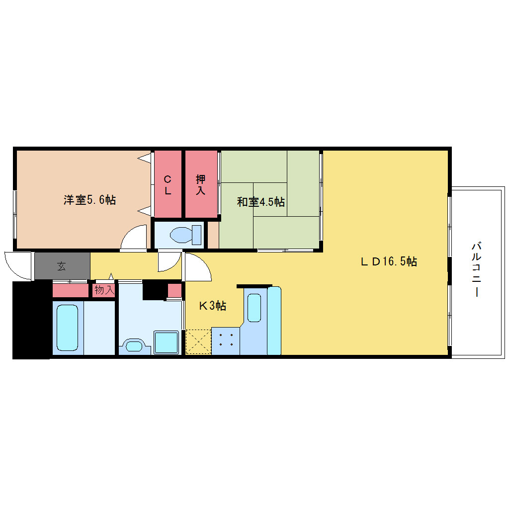 | 間取り詳細 | 洋室 5.6畳 、和室 4.5畳 、LD 16.5畳 、K 3畳 |