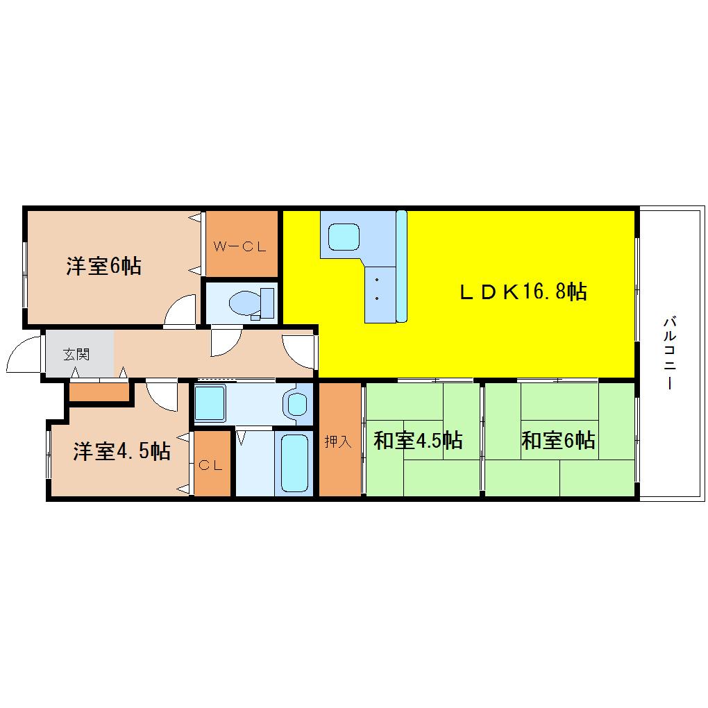 | 間取り詳細 | LDK 16.8畳 、洋室 6畳 、洋室 4.5畳 、和室 6畳 、和室 4.5畳 |
