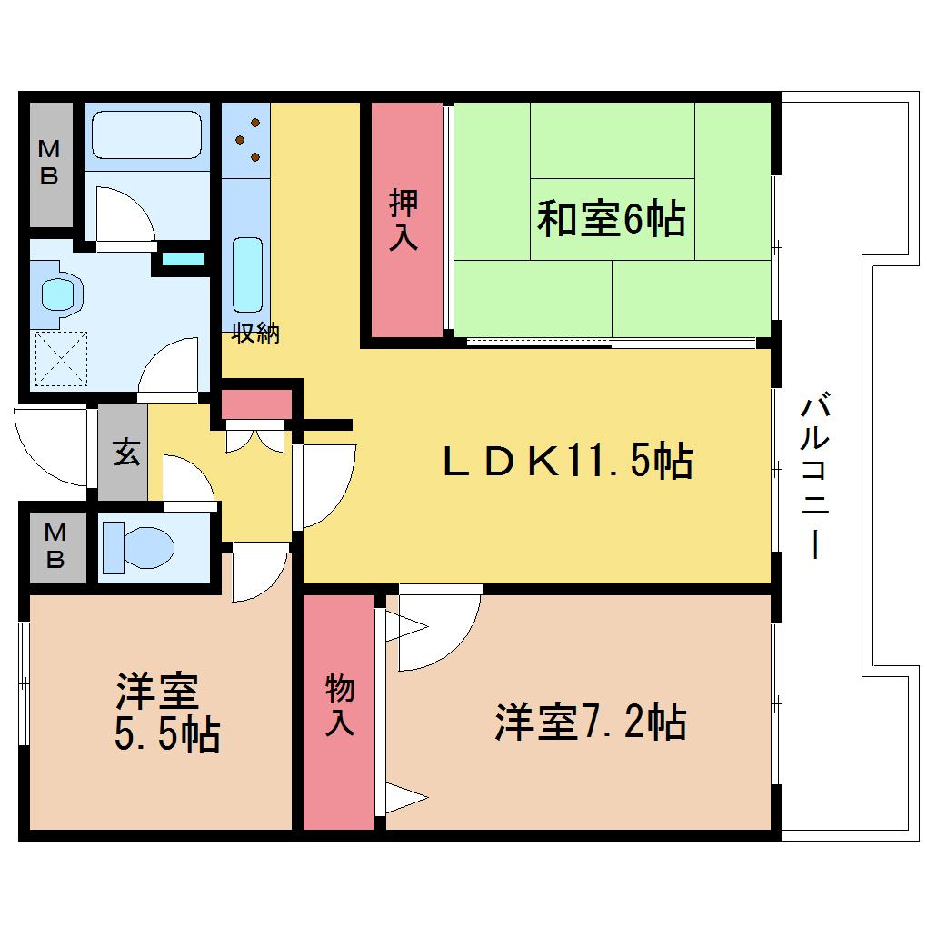 | 間取り詳細 | LDK 11.5畳 、洋室 7.2畳 、洋室 5.5畳 、和室 6畳 |