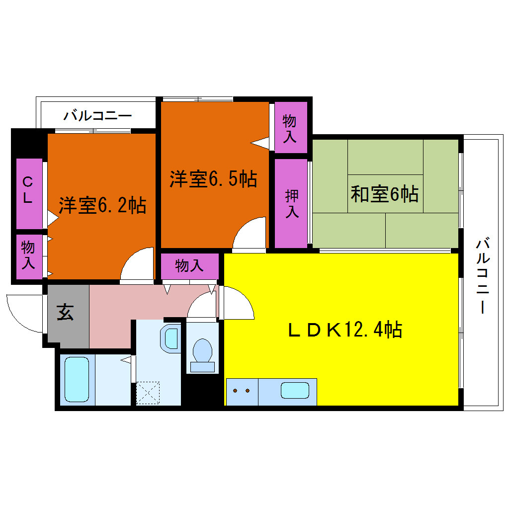| 間取り詳細 | 和室 6畳 、洋室 6.2畳 、LDK 12.4畳 、洋室 6.5畳 |