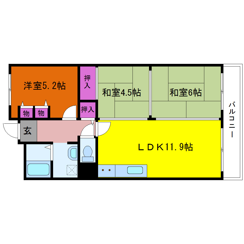 | 間取り詳細 | 和室 4.5畳 、和室 6畳 、LDK 11.9畳 、洋室 5.2畳 |