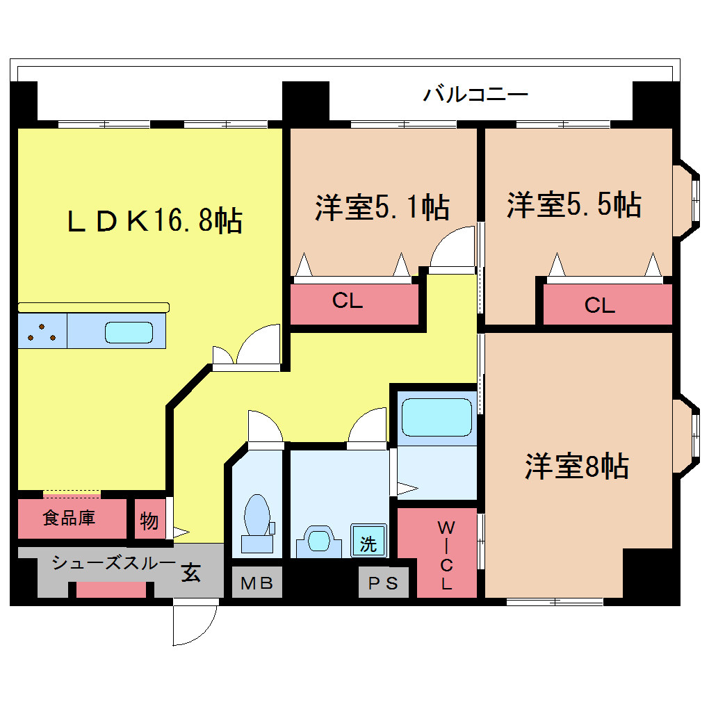 | 間取り詳細 | 洋室 8畳 、洋室 5.5畳 、洋室 5.1畳 、LDK 16.8畳 |
