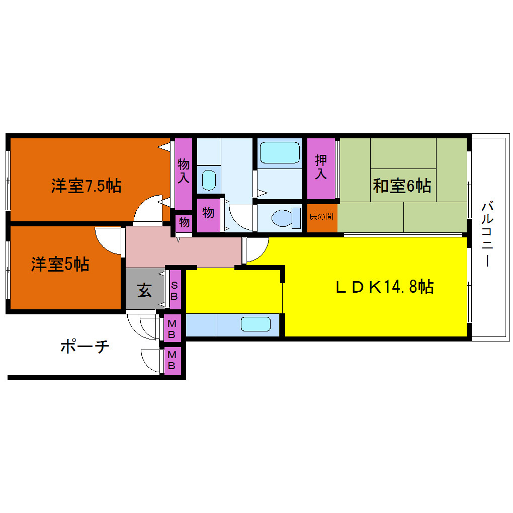 | 間取り詳細 | 洋室 5畳 、洋室 7.5畳 、洋室 6畳 、LDK 14.8畳 |