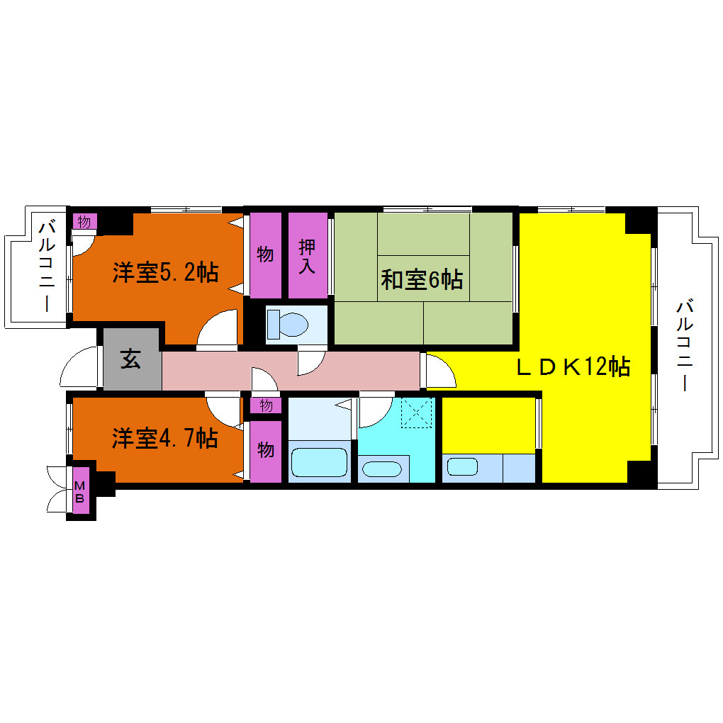 | 間取り詳細 | 洋室 5.2畳 、洋室 4.7畳 、和室 6畳 、LDK 12畳 |
