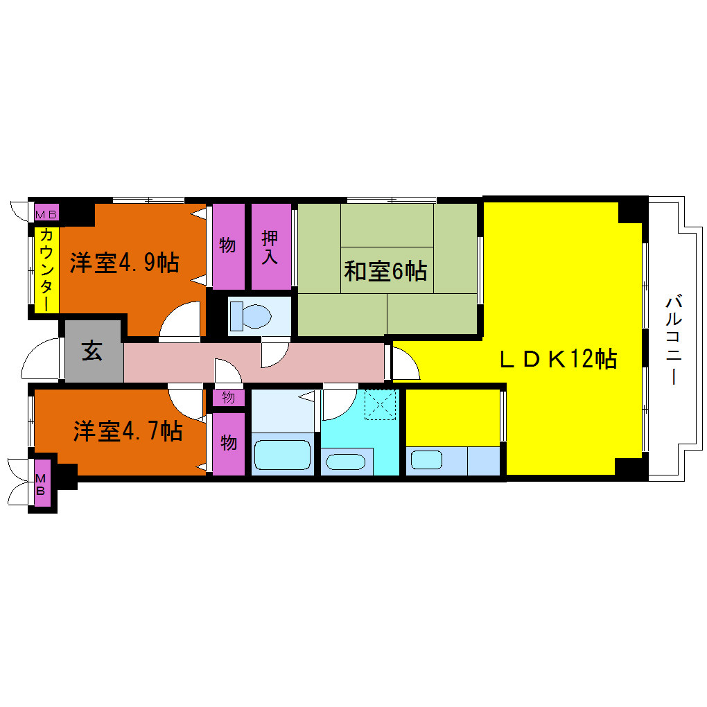洋室 4.7畳 和室 6畳 LDK 12畳 |
