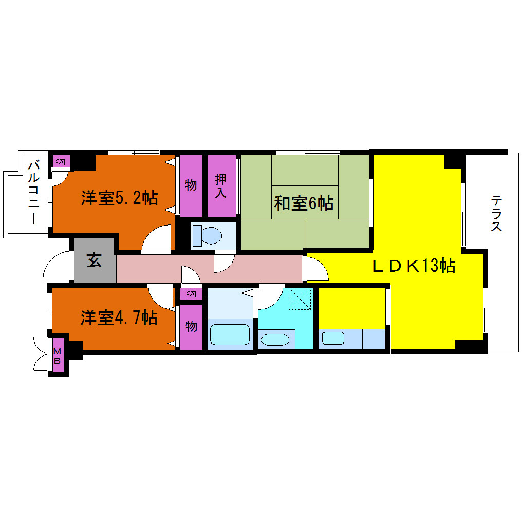 洋室 4.7畳 和室 6畳 LDK 13畳 |
