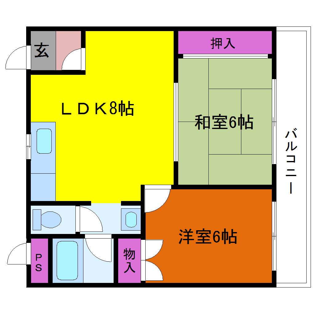 | 間取り詳細 | LDK 8畳 、洋室 6畳 、和室 6畳 |
