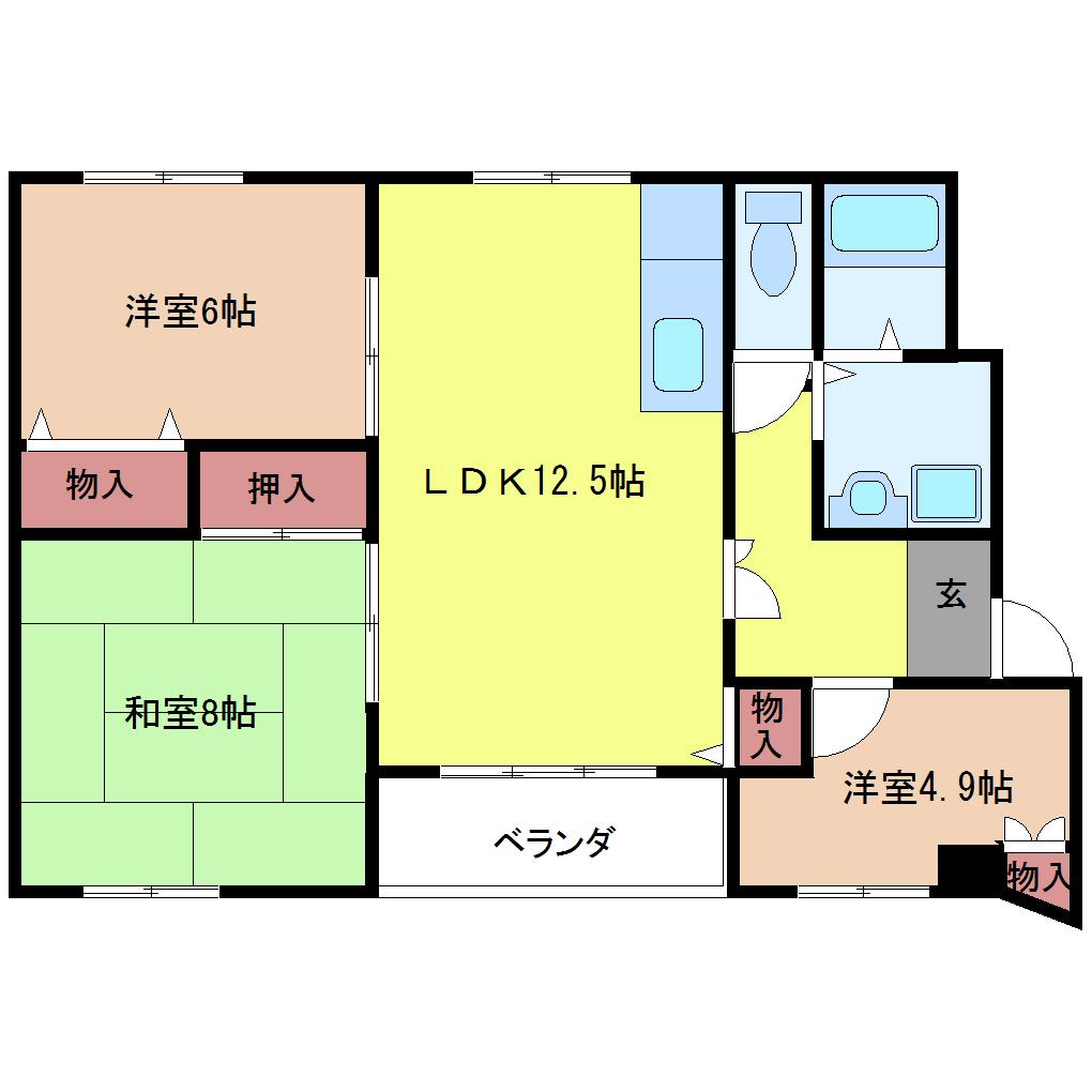 | 間取り詳細 | LDK 12.5畳 、和室 8畳 、洋室 6畳 、洋室 4.9畳 |