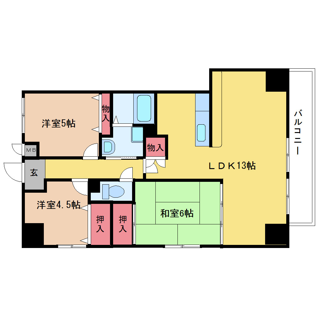 | 間取り詳細 | 洋室 4.5畳 、洋室 5畳 、LDK 13畳 、和室 6畳 |