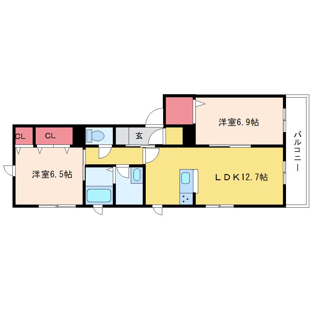 | 間取り詳細 | LDK 12.7畳 、洋室 6.9畳 、洋室 6.5畳 |