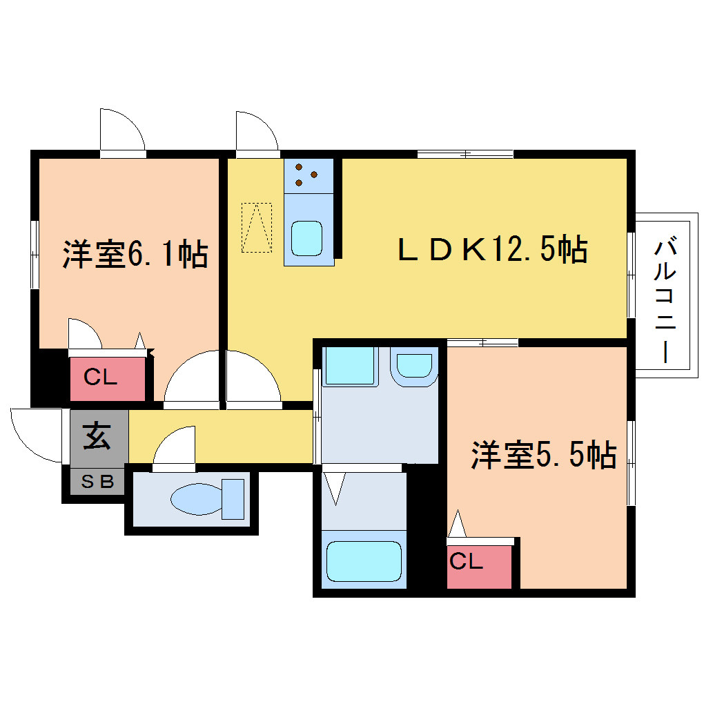 | 間取り詳細 | LDK 12.5畳 、洋室 6.1畳 、洋室 5.5畳 |