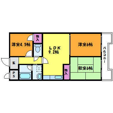 | 間取り詳細 | LDK 9.2畳 、洋室 6畳 、和室 6畳 、洋室 4.5畳 |