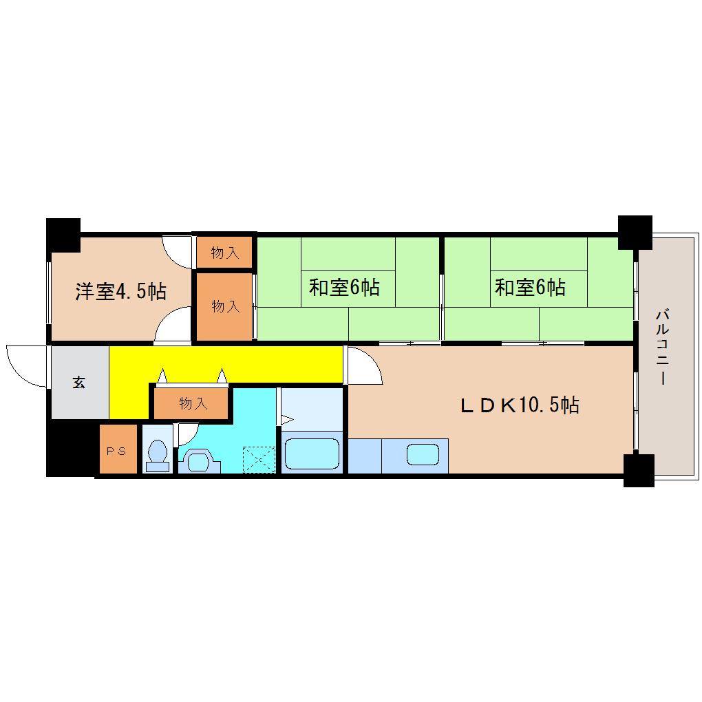 | 間取り詳細 | 洋室 4.5畳 、和室 6畳 、和室 6畳 、LDK 10.5畳 |