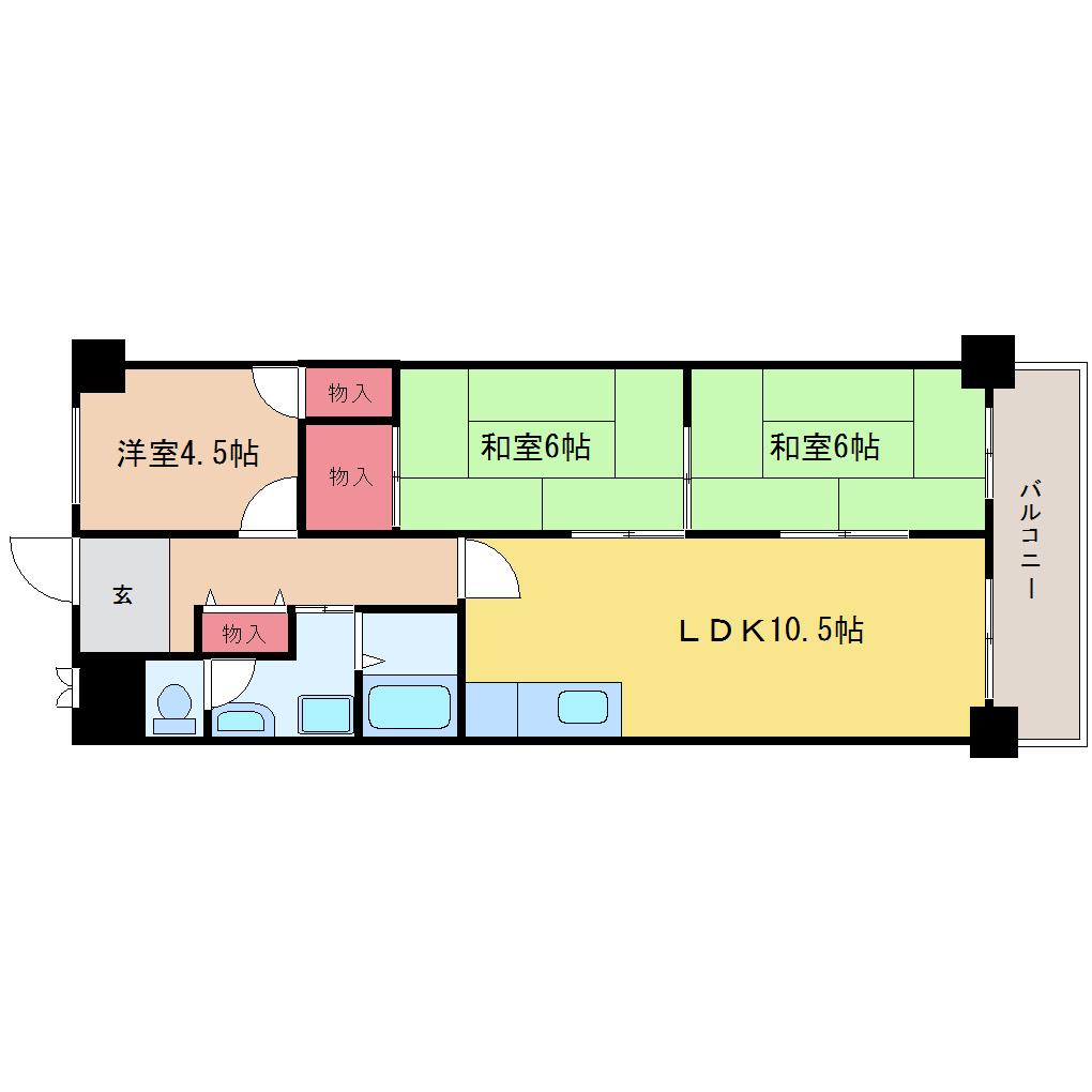 | 間取り詳細 | 洋室 4.5畳 、和室 6畳 、和室 6畳 、LDK 10.5畳 |
