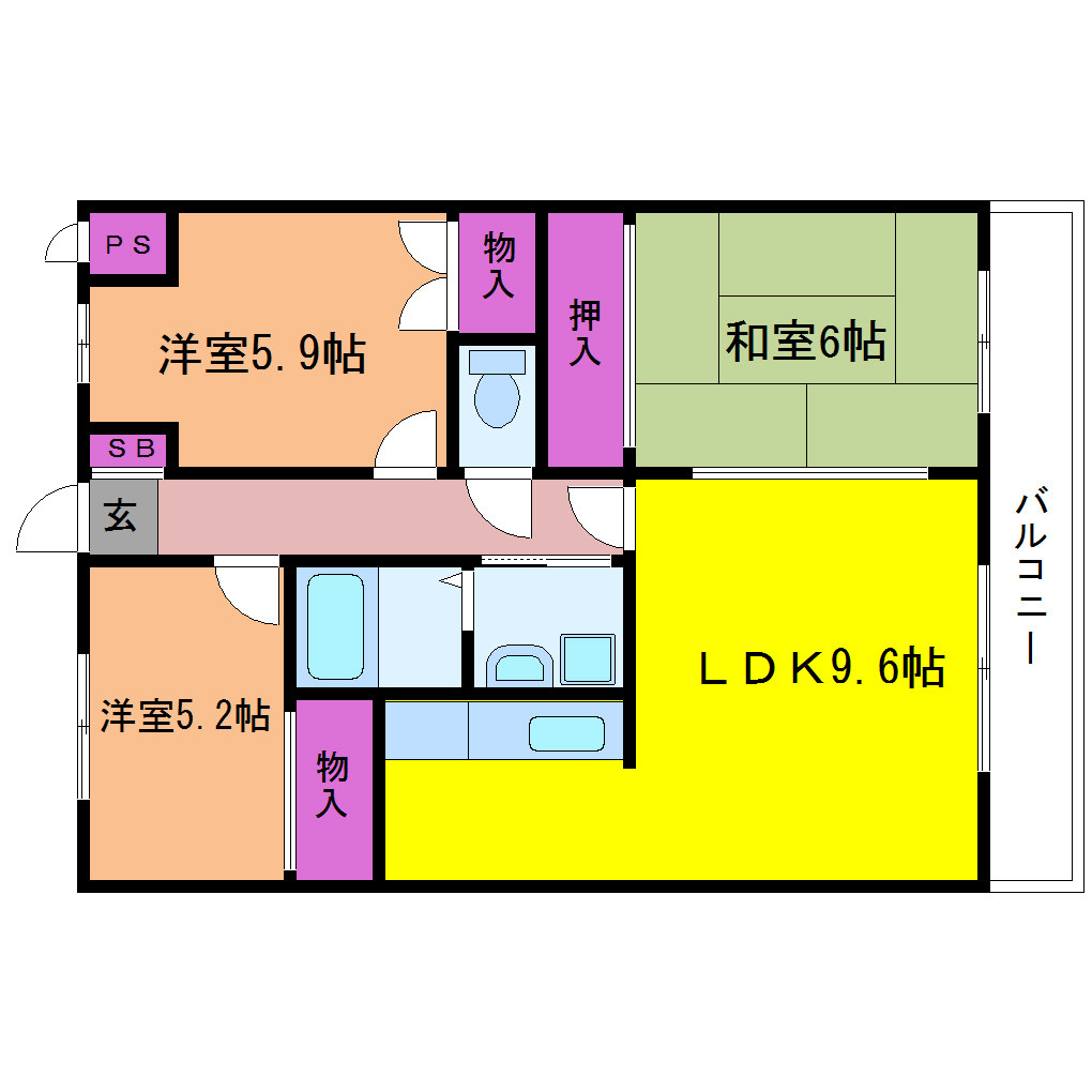 洋室 5.9畳 和室 6畳 LDK 9.6畳 |