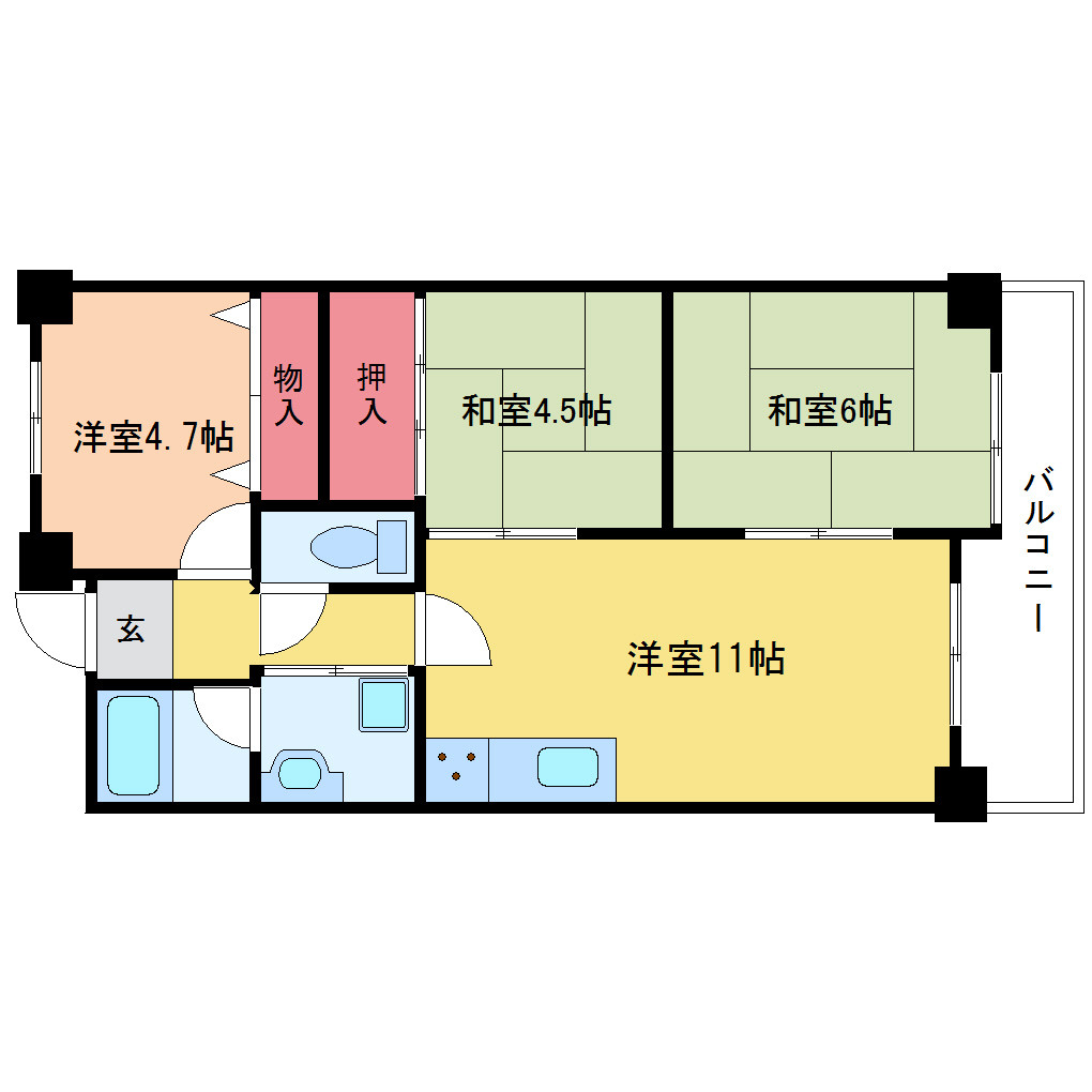| 間取り詳細 | LDK 13畳 、和室 6畳 、和室 4.5畳 、洋室 5畳 |