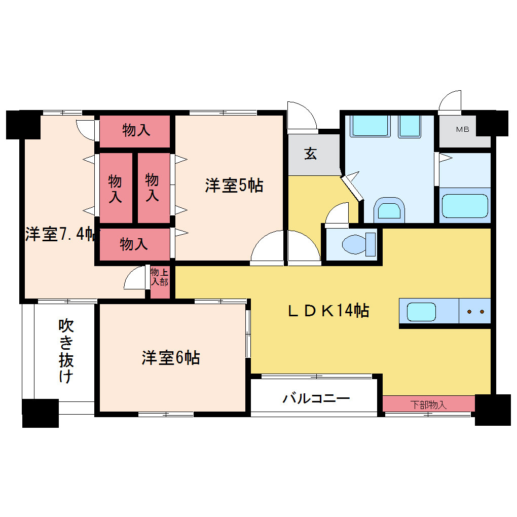 | 間取り詳細 | LDK 14畳 、洋室 5畳 、洋室 5畳 、洋室 7.4畳 |