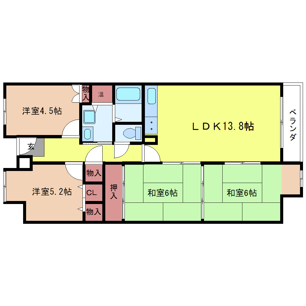 | 間取り詳細 | 洋室 5.2畳 、洋室 4.5畳 、和室 6畳 、和室 6畳 、LDK 13.8畳 |