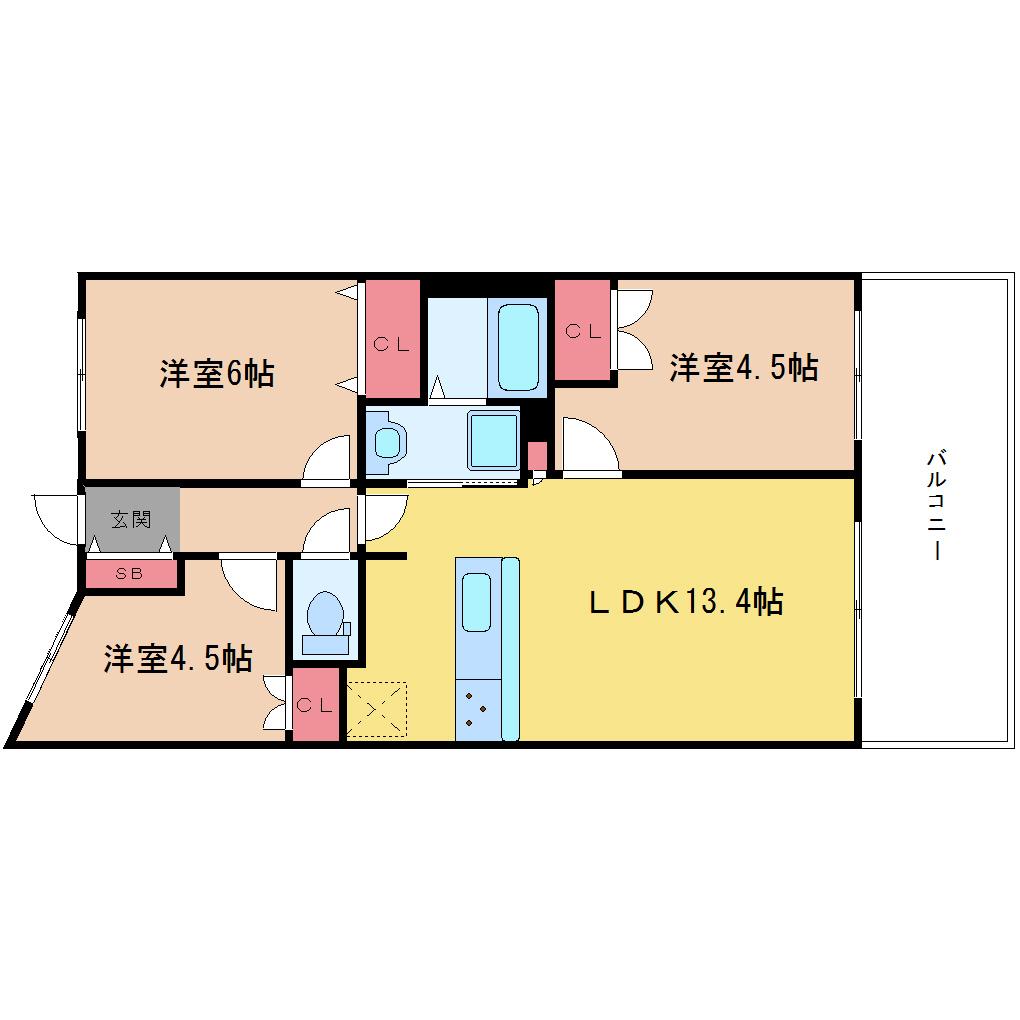 | 間取り詳細 | LDK 13.4畳 、洋室 4.5畳 、洋室 6畳 、洋室 4.5畳 |