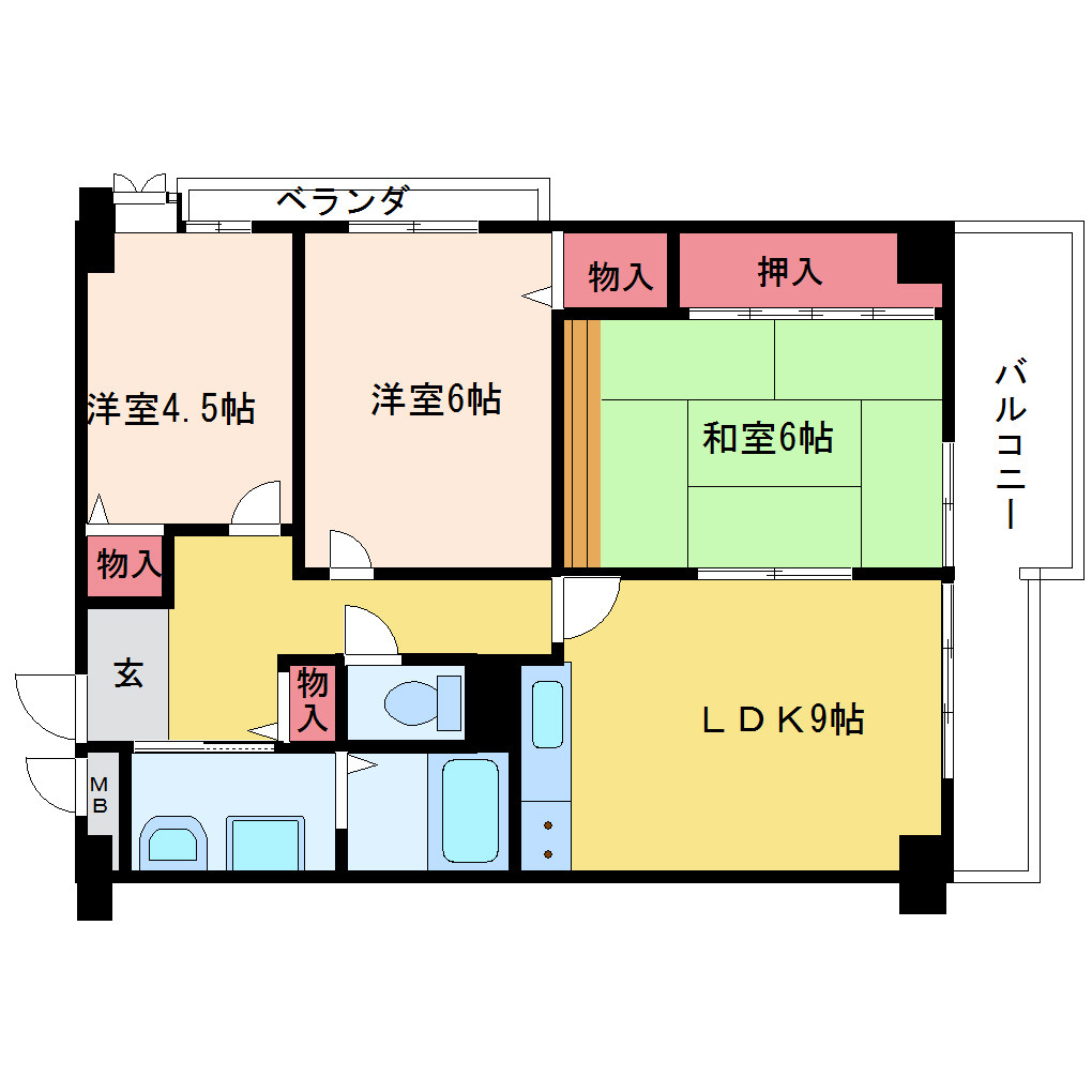 | 間取り詳細 | LDK 9畳 、洋室 4.5畳 、洋室 6畳 、和室 6畳 |