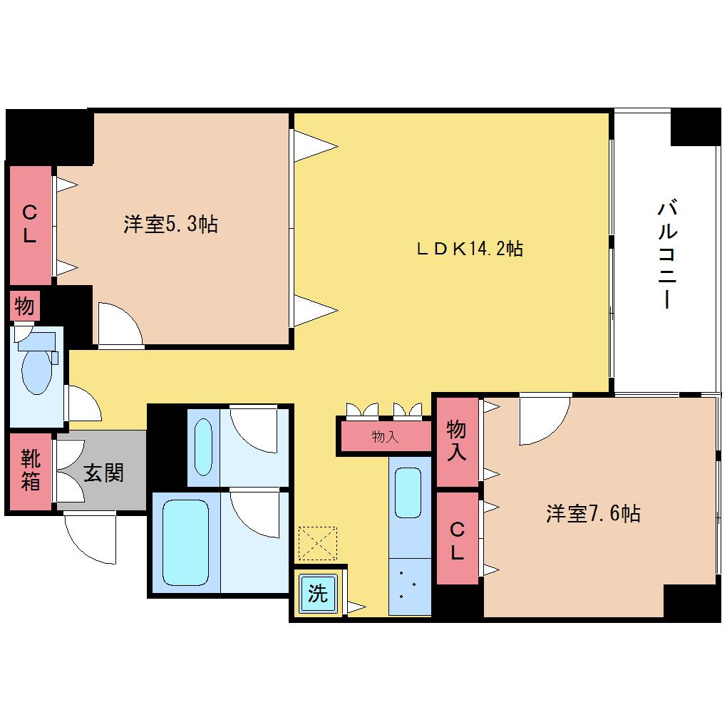 | 間取り詳細 | LDK 14.2畳 、洋室 7.6畳 、洋室 5.3畳 |