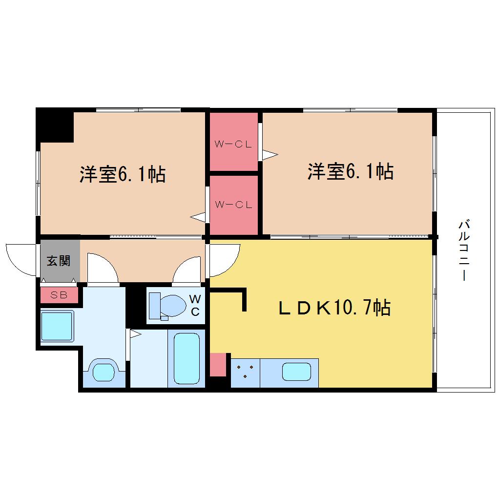 | 間取り詳細 | LDK 10.7畳 、洋室 6.1畳 、洋室 6.1畳 |