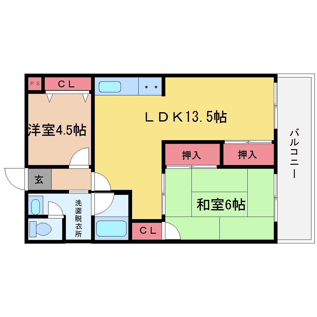 | 間取り詳細 | LDK 13.5畳 、洋室 4.5畳 、和室 6畳 |
