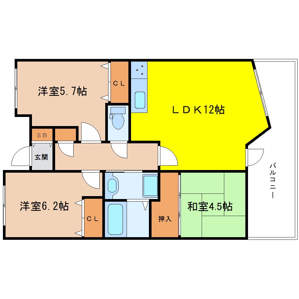 | 間取り詳細 | LDK 12畳 、洋室 5.7畳 、洋室 6.2畳 、和室 4.5畳 |
